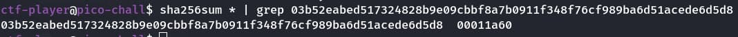 sha256sum * | grep 03b52eabed517324828b9e09cbbf8a7b0911f348f76cf989ba6d51acede6d5d8
