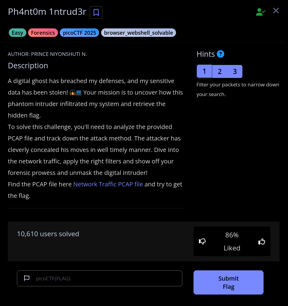 Description: A digital ghost has breached my defenses, and my sensitive data has been stolen! 😱💻 Your mission is to uncover how this phantom intruder infiltrated my system and retrieve the hidden flag. To solve this challenge, you’ll need to analyze the provided PCAP file and track down the attack method. The attacker has cleverly concealed his moves in well timely manner. Dive into the network traffic, apply the right filters and show off your forensic prowess and unmask the digital intruder!